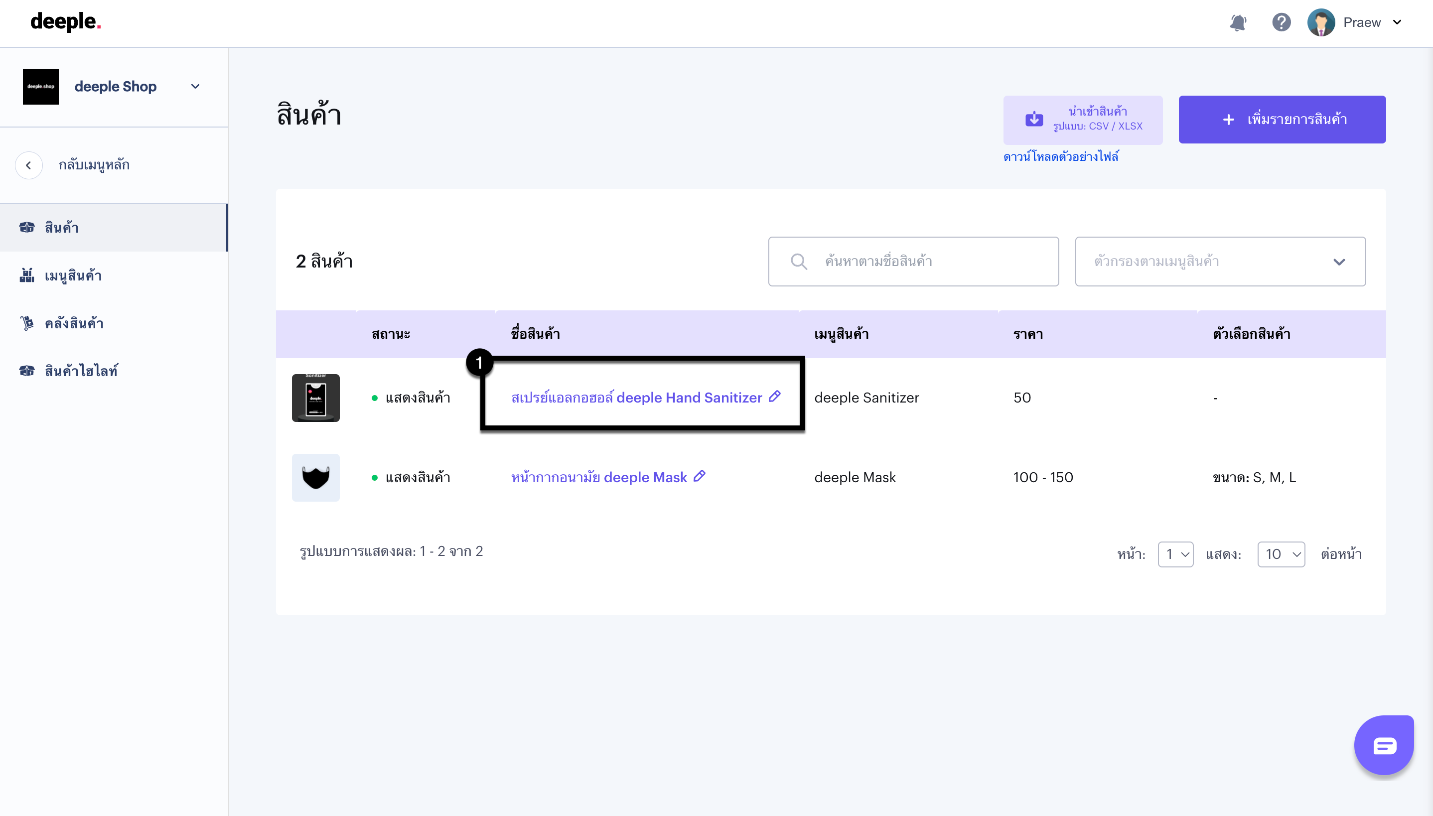 ตัวอย่าง ร้าน deeple Shop ต้องการลบตัวเลือกของสินค้าหน้ากากอนามัย deeple Mask ไซส์ M ออกจากระบบ สามารถทำตามขั้นตอนได้ดังนี้